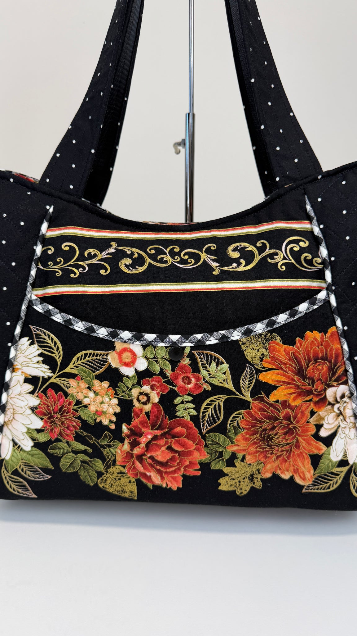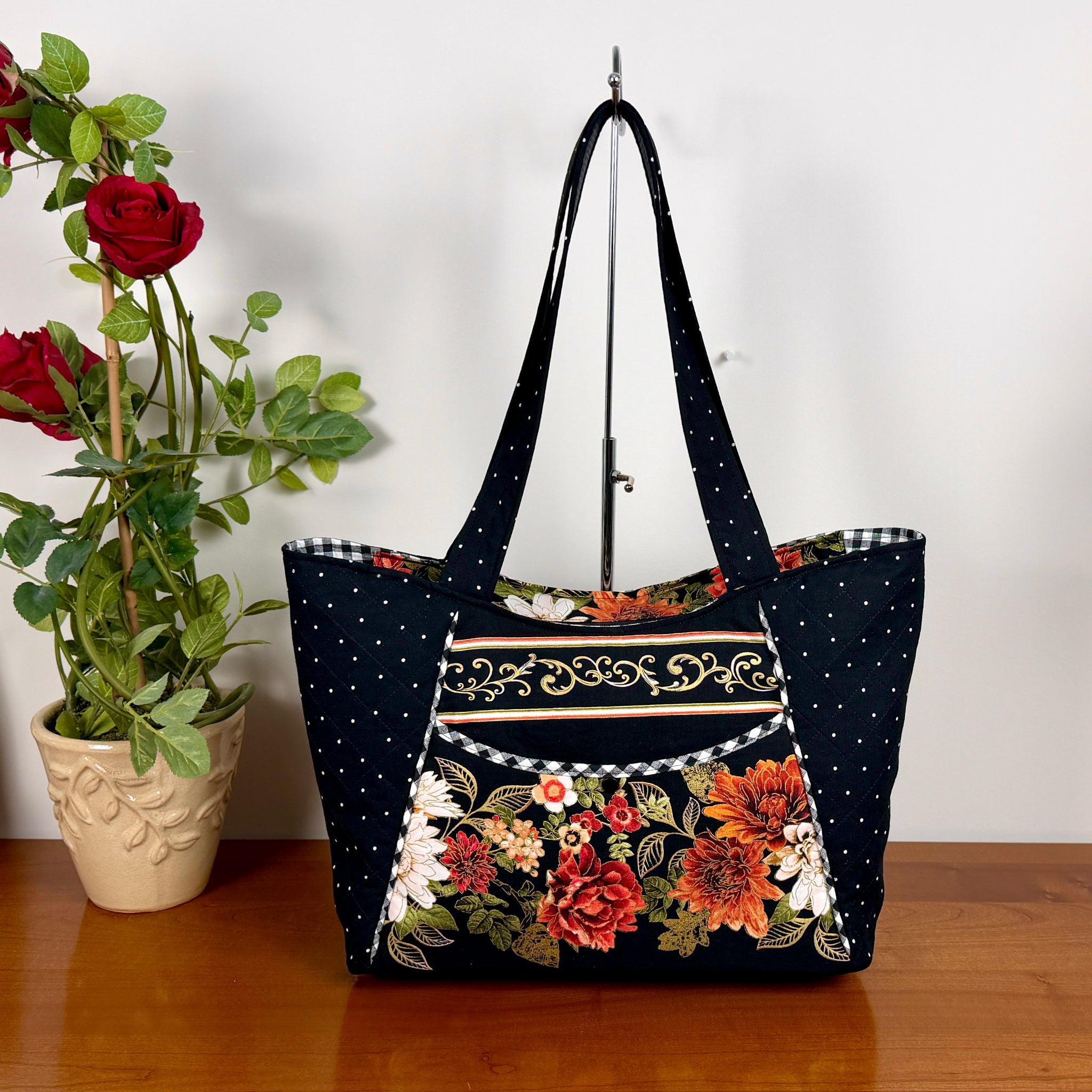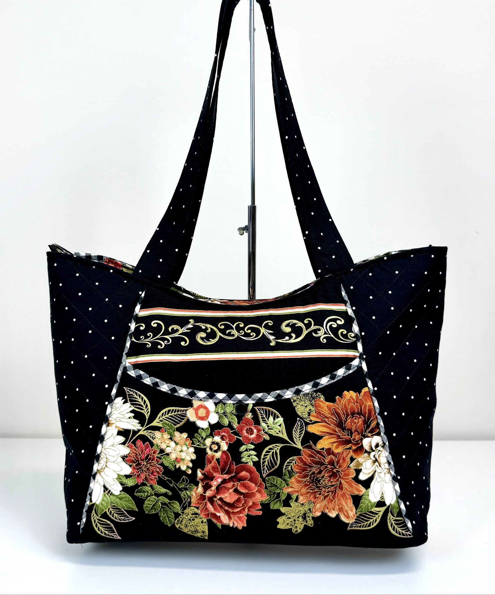 Floral tote bag with black quilted handles in front of a bookshelf with fabric samples.