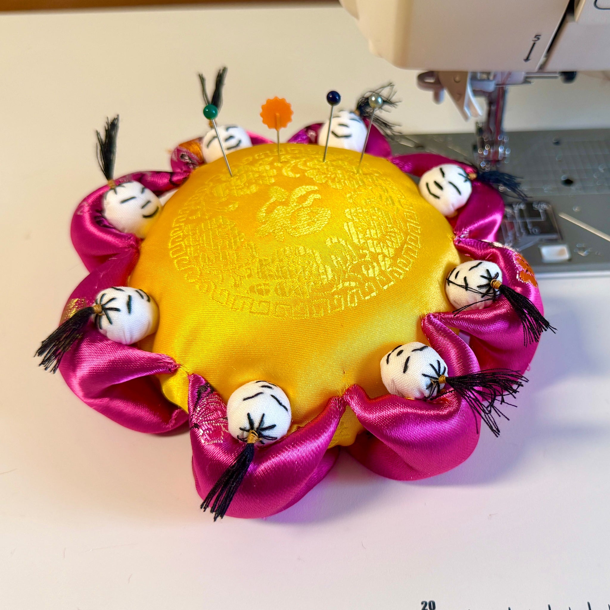 Decorative silk pincushion with pink fabric and white beads on a sewing machine