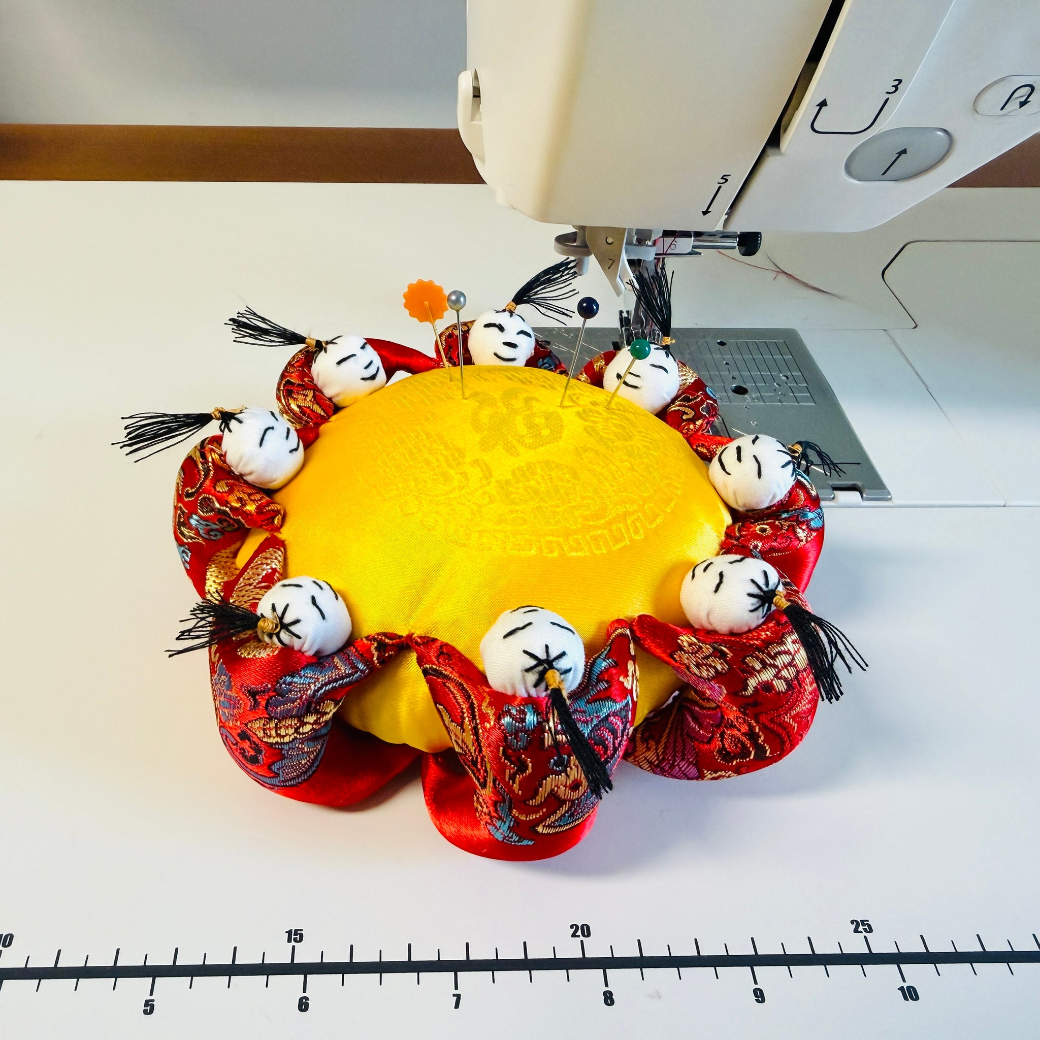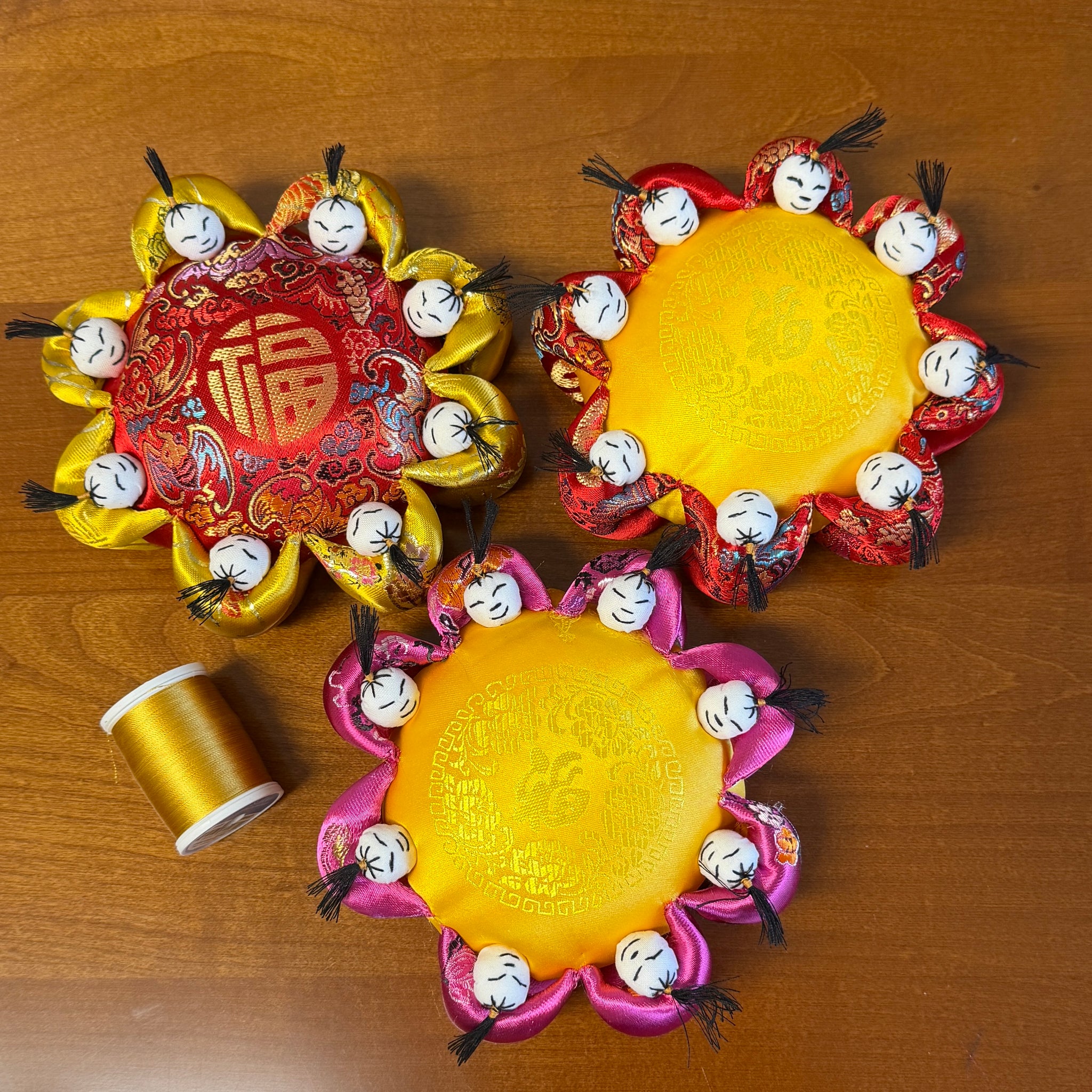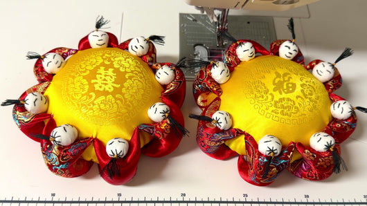 This handmade silk pincushion is featured with gold silk 富 (Prosperous) in the middle. It is surrounded with 8 little persons. Number eight represent luck and good fortune.